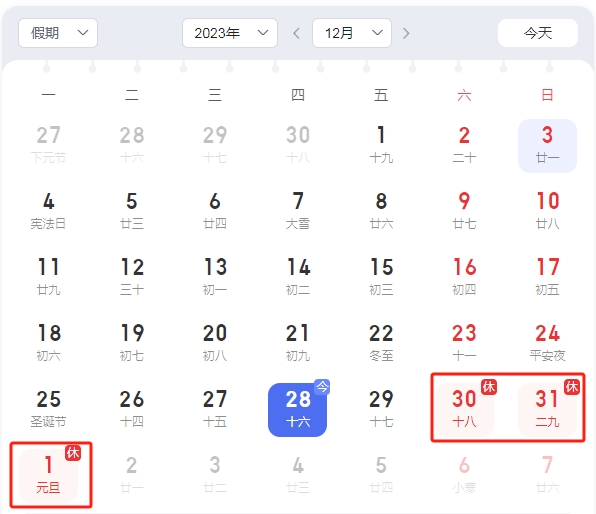 放假時(shí)間:2023年12月30日(星期六)至2024年1月1日(星期一),共計(jì)3天。