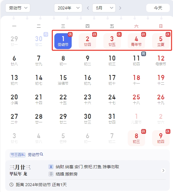2024年勞動節放假時間安排: 5月1日(星期三)至5月5日(星期日)放假調休,共5天。5月6日(星期一)上班。