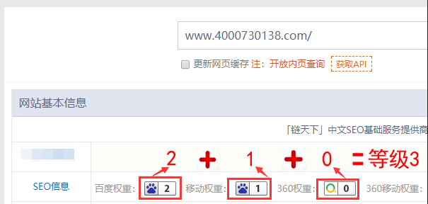 網站等級計算方法:百度PC權重+百度移動權重+360PC權重  以站長工具(chinaz)數據為準